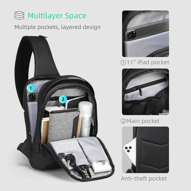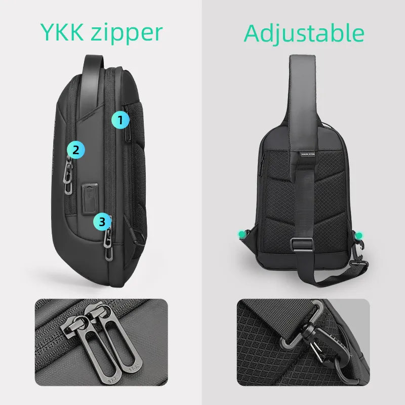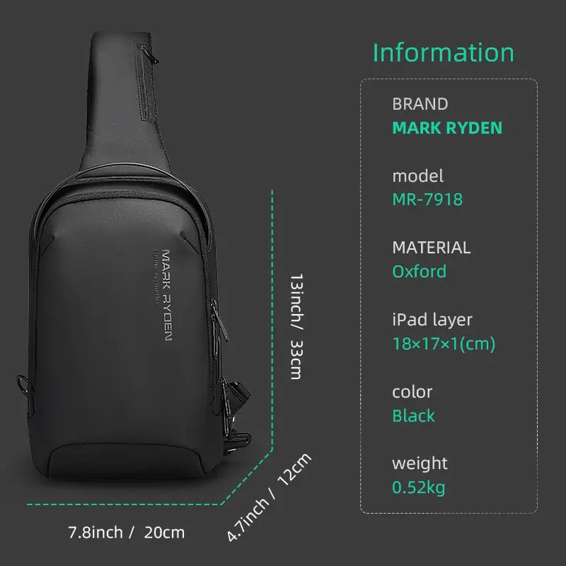 The Mark Ryden Sling Backpack MR7618 is a stylish and functional crossbody bag for men. Featuring a customizable design, USB charging port, and compact yet spacious compartments, it’s perfect for daily commutes, travel, or cycling. Durable, lightweight, and built for modern lifestyles.Product Description